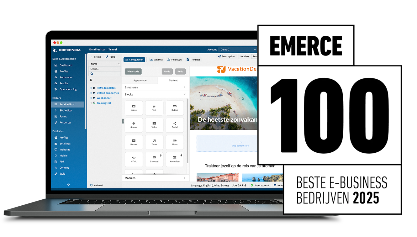 Al meerdere jaren op rij is Copernica benoemd tot beste e-mailmarketingsoftware van Nederland. Daarom weet je zeker dat je voor e-mail bij Copernica altijd goed zit.